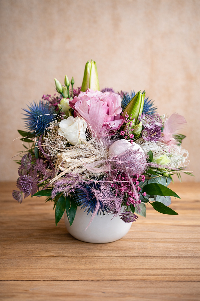 Schönes Arrangement in rosa, weiß und blau mit dazu passenden Blumen der Saison, österlich dekoriert.
