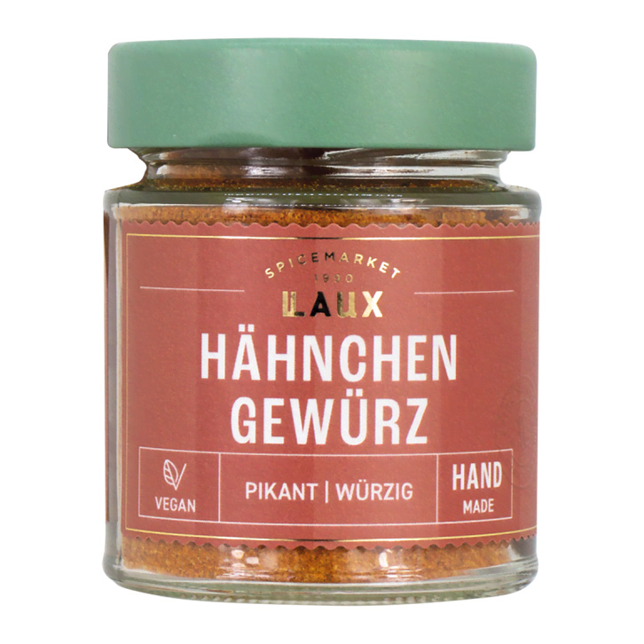 Zum Fingerschlecken lecker! LAUX Hähnchen Gewürz macht aus Brathähnchen, Hähnchenschenkel, Chicken Wings oder kurzgebratenem Hähnchenfleisch ein superleckeres Geschmackserlebnis. Zutaten wie Paprikapulver, Currypulver mit den typischen Gewürzen von Kurkuma, Ingwer bis Muskatnuss, außerdem Zwiebeln und ein Hauch von Zimt sind fein mit Salz und Cayennepfeffer fertig gemischt und abgeschmeckt. Tipp: Das LAUX Hähnchen Gewürz ist auch als Marinade für Hähnchenfleisch zum Grillen genial und sorgt für einzigartiges Aroma jedes Geflügels – von Huhn bis Pute! Ganz ohne Geschmacksverstärker und künstliche Zusatzstoffe, Aromastoffe oder Rieselhilfen in der LAUX Manufaktur hergestellt.
