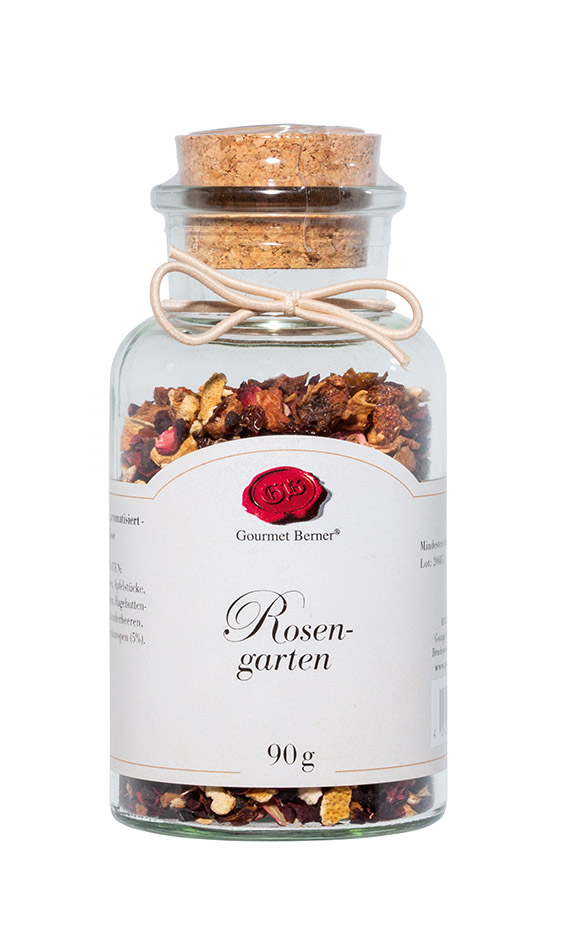 Zutaten: Hibiskusblüten, Apfelstücke, Orangenschalen, Hagebuttenschalen, Holunderbeeren, Aroma, Rosenknospen (3%)