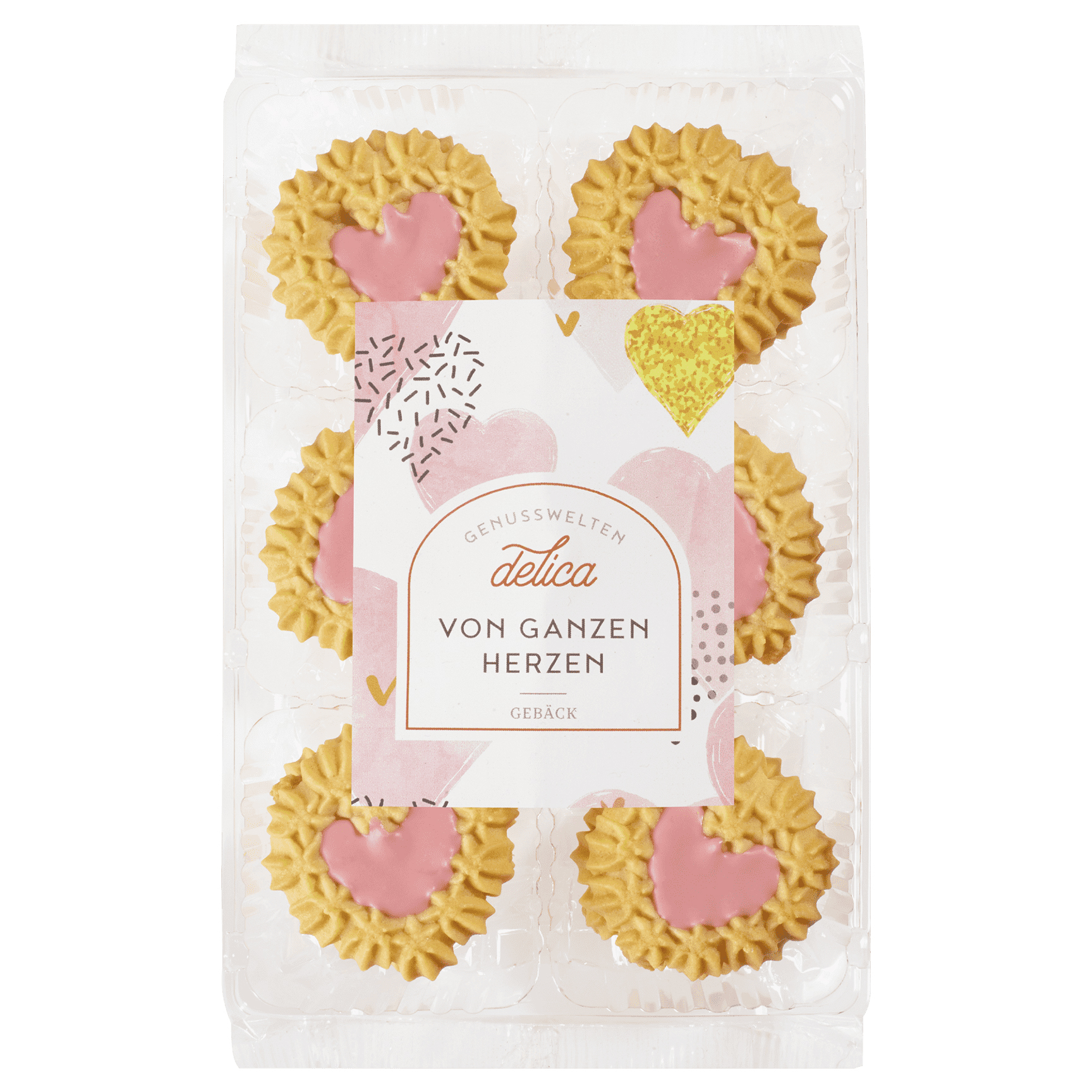 Knusprige Gebäck-Röschen mit Erdbeerfüllung in Herzform.